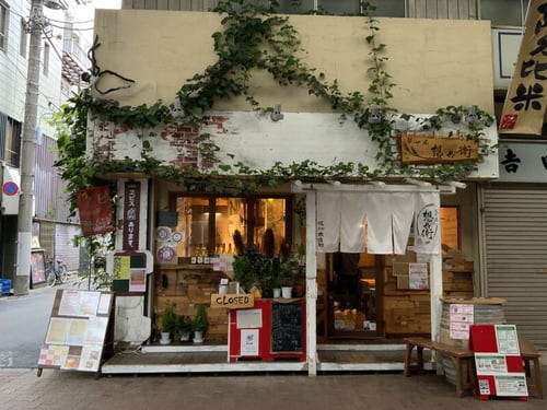 和の古木と洋のレンガが調和した外観は、佐竹商店街のレトロな雰囲気に溶け込みつつ、個性を放つ佇まいです。